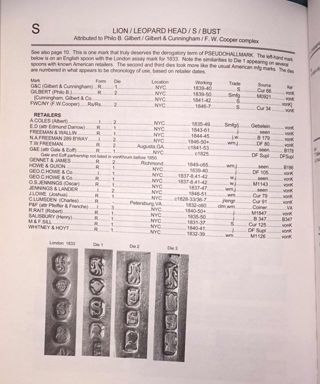 McGrew shows three American dies with the lion/leopard head/S/bust. The one shown in this thread is McGrew's die number 1, but all are based on the London assay mark for 1833. As such, McGrew states that they deserve "the derogatory term of PSEUDOHALLMARK". In any event die number 1 is found on the following retailers: E.D. (attr Edmund Darros) Freeman and Wallin G&E (attr to Gale & Eoff) Howe & Union Geo.C. Howe & Co. O.S. Hennings J. Lowe R. Rait Salisbury M.& F. Sill Whitney & Hoyt McGrew's die number 2 is found on Gennet & James; A. Coles; N.A. Freeman; T.W. Freeman; Jennings & Lander; while die number 3 is found on P& F (attr to Pfeiffer & Frenche) From this thread it is also clear that die number 1 is also found on silver with the mark of Gennet. Die number 1 also appears on the silver of G & C (Gilbert and Cunningham), while die number 2 appears on silver from Gilbert (Philo B) and FWC/NY (F.W. Cooper). From this I assume that McGrew attributes Philo Gilbert/ Gilbert & Cunningham and F.W. Cooper complex as the manufacturers. IP: Logged |
