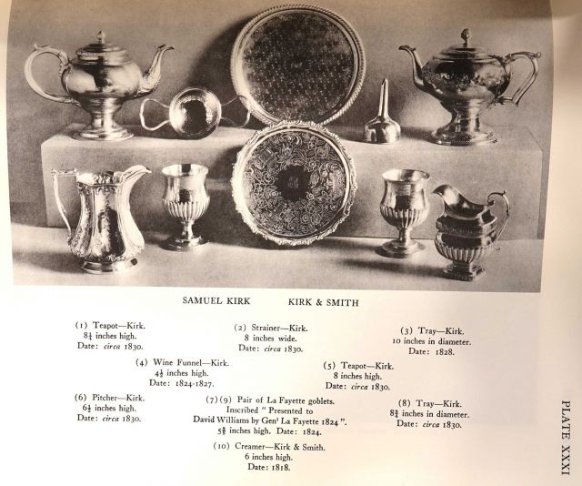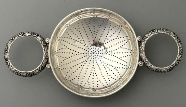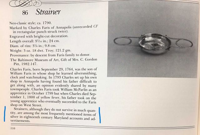 I came across this Kirk punch strainer recently. These strainers are called punch strainers in the US, lemon strainers in the UK and are even sometimes misnamed tea strainers. The mark on this stainer was used by Kirk from 1830 until 1846. The photo below from Goldsborough’s book Silver in Maryland shows another Baltimore strainer, this time by Charles Faris.. This strainer also has loop handles and it is shown here because of the observation that strainers were frequently mentioned in 18th century accounts but for unknown reasons few seem to have survived. IP: Logged |